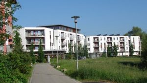 Neubau eines Gebäudeensembles aus insgesamt 5 dreigeschossigen Wohn- und 2 zweigeschossigen Sozialgebäuden in Holzmodulbauweise mit außenliegenden Treppenhäusern